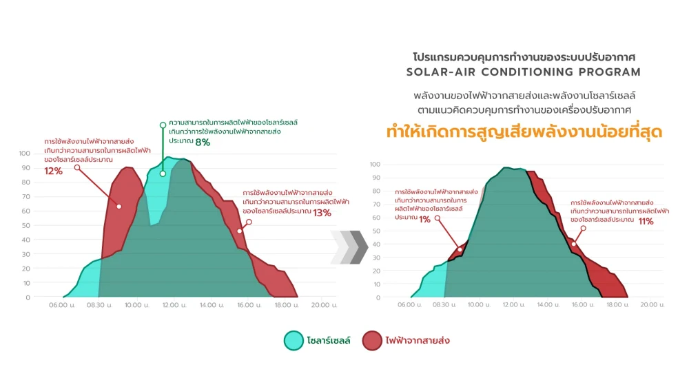 เนื่องจากปัจจุบันได้มีการปรับเปลี่ยนภายในร้านเป็น modern trade store จึงมีการติดตั้งและใช้ระบบปรับอากาศ ซึ่งมีการใช้ไฟประมาณ 60-70% ของการใช้ไฟในอาคารทั้งหมด โดยธรรมชาติของระบบปรับอากาศทั่วไป จะใช้พลังงานสูงสุดในช่วงเปิดเครื่องปรับอากาศ และใช้พลังงานลดลงหลังจากทำงานได้ 2-3 ชั่วโมง และจะใช้พลังงานมากอีกครั้งในช่วงบ่ายโมงไปจนถึงบ่ายสามโมง และเริ่มลดลงจนกระทั่งปิดการทำงาน แต่พลังงานจากโซลาร์เซลล์เริ่มผลิตพลังงานเป็นปริมาณน้อยในช่วงเช้า และจะผลิตสูงสุดในช่วง 11.00 – 13.00 น. ซึ่งการทำงานของระบบปรับอากาศและพลังงานจากโซลาร์ข้างต้นเกิดการสูญเสียพลังงานที่โซลาร์เซลล์ผลิตได้ มิได้นำไปใช้อย่างเต็มประสิทธิภาพ ทางสยามโกลบอลเฮาส์ เป็นบริษัทแรกที่นำแนวคิดการใช้ระบบควบคุมการทำงานของระบบปรับอากาศให้สอดคล้องกับพลังงานโซลาร์เซลล์ ซึ่งสามารถนำพลังงานที่สูญเสียไปมาใช้ให้เกิดประสิทธิภาพ สามารถลดการใช้พลังงานจากการไฟฟ้าประมาณ 15-20%