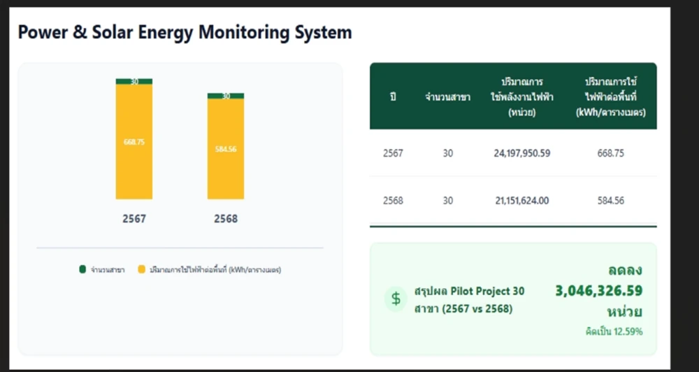 บริษัทได้เริ่มทดลองติดตั้งระบบ Power & Solar Energy Monitoring System ใน 30 สาขา พร้อมเปรียบเทียบปริมาณการใช้ไฟฟ้าระหว่างปี 2567 และปี 2568 ผลการดำเนินงานพบว่า ระบบสามารถตรวจจับความผิดปกติของการใช้ไฟฟ้าได้อย่างรวดเร็วและแม่นยำ ส่งผลให้สามารถลดการสูญเสียพลังงานที่ไม่จำเป็นลงได้ประมาณ 3,046,326.59 หน่วย หรือคิดเป็นร้อยละ 12.59 ของปริมาณการใช้ไฟฟ้า ซึ่งเทียบเท่ากับการลดการปล่อยก๊าซเรือนกระจกได้ประมาณ 1,520 ตันคาร์บอนไดออกไซด์เทียบเท่า (tCO₂e) แสดงให้เห็นถึงประสิทธิผลของระบบในการยกระดับการบริหารจัดการพลังงาน ช่วยลดต้นทุน ควบคู่กับการลดผลกระทบต่อสิ่งแวดล้อมอย่างเป็นรูปธรรม